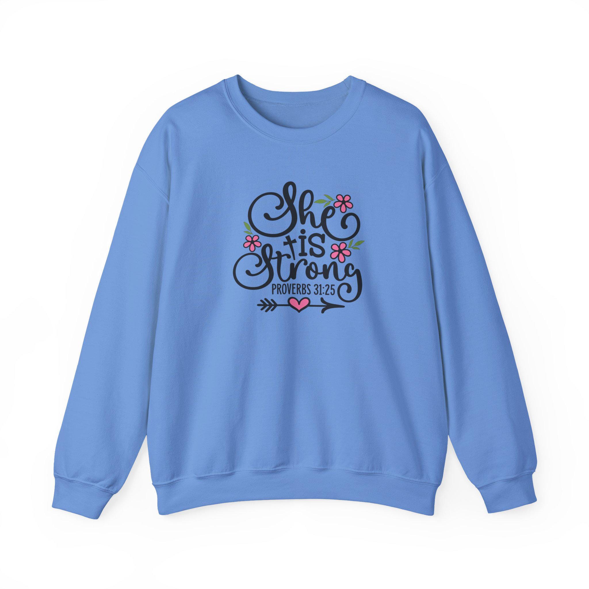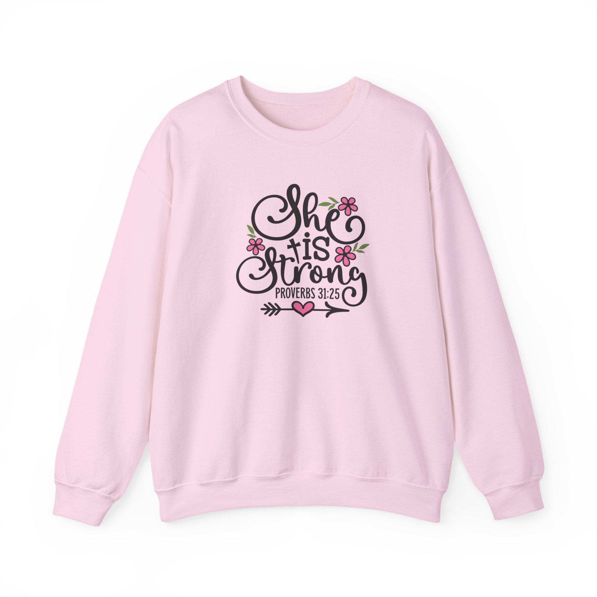 Order today to add this limited-availability sweatshirt to your collection or gift it to a loved one. Our shop guarantees prompt shipping and hassle-free returns, ensuring your satisfaction with each purchase.This cozy Proverbs 31 She is Strong Crewneck Sweatshirt